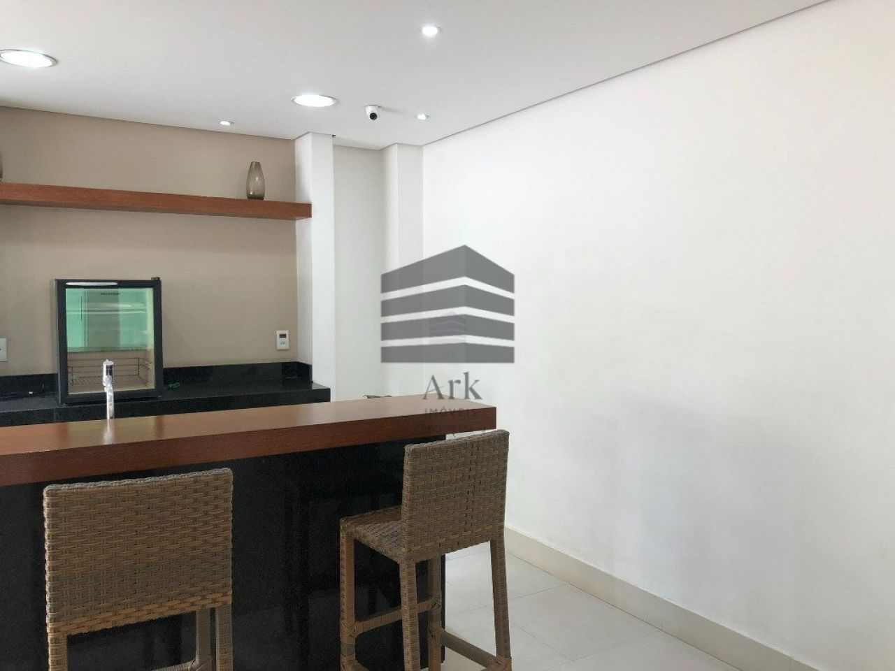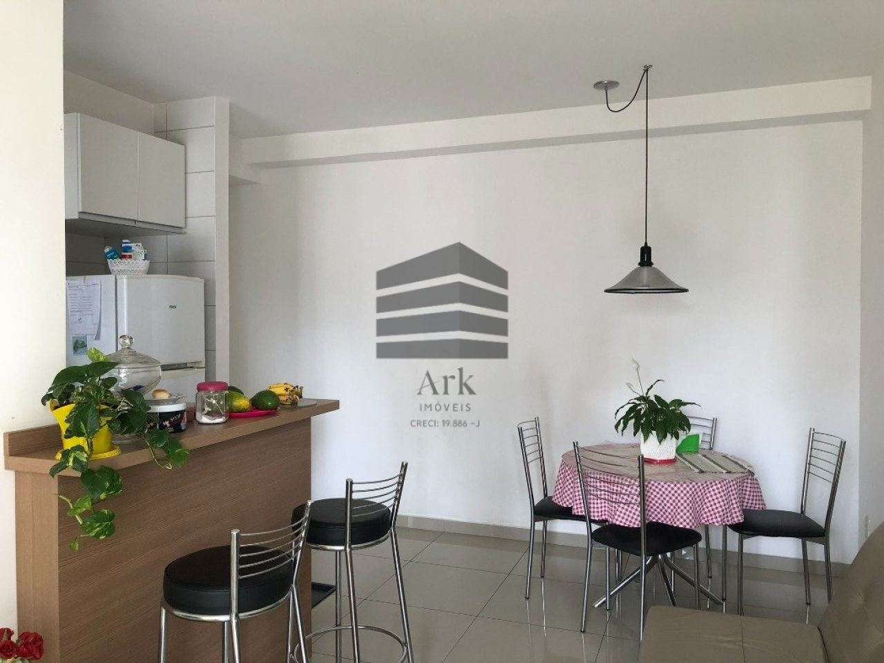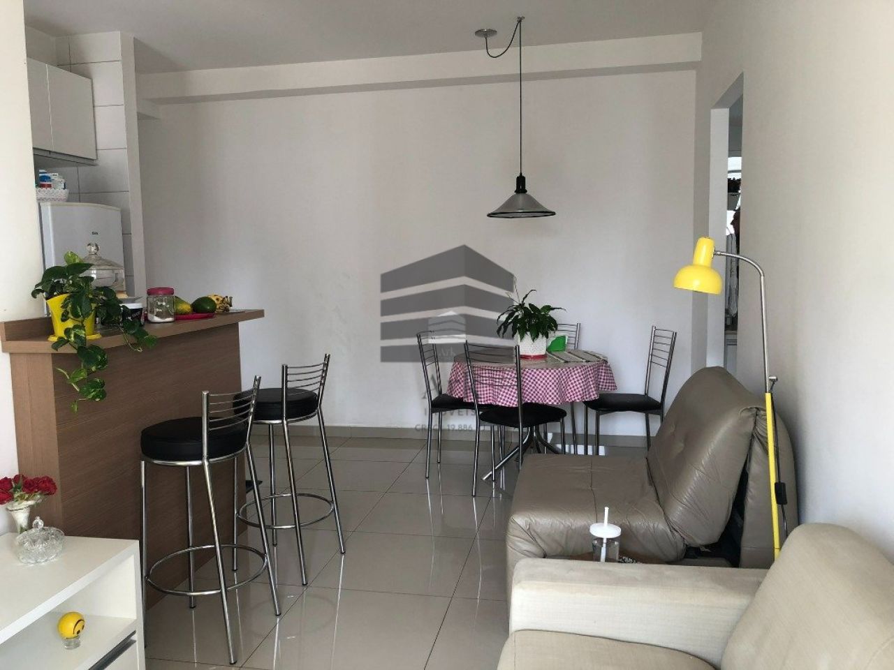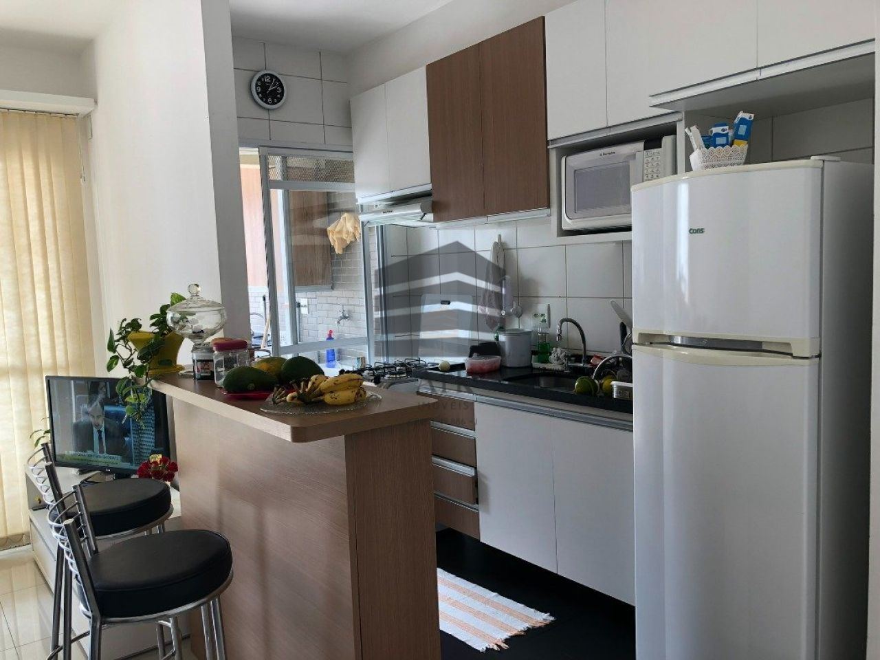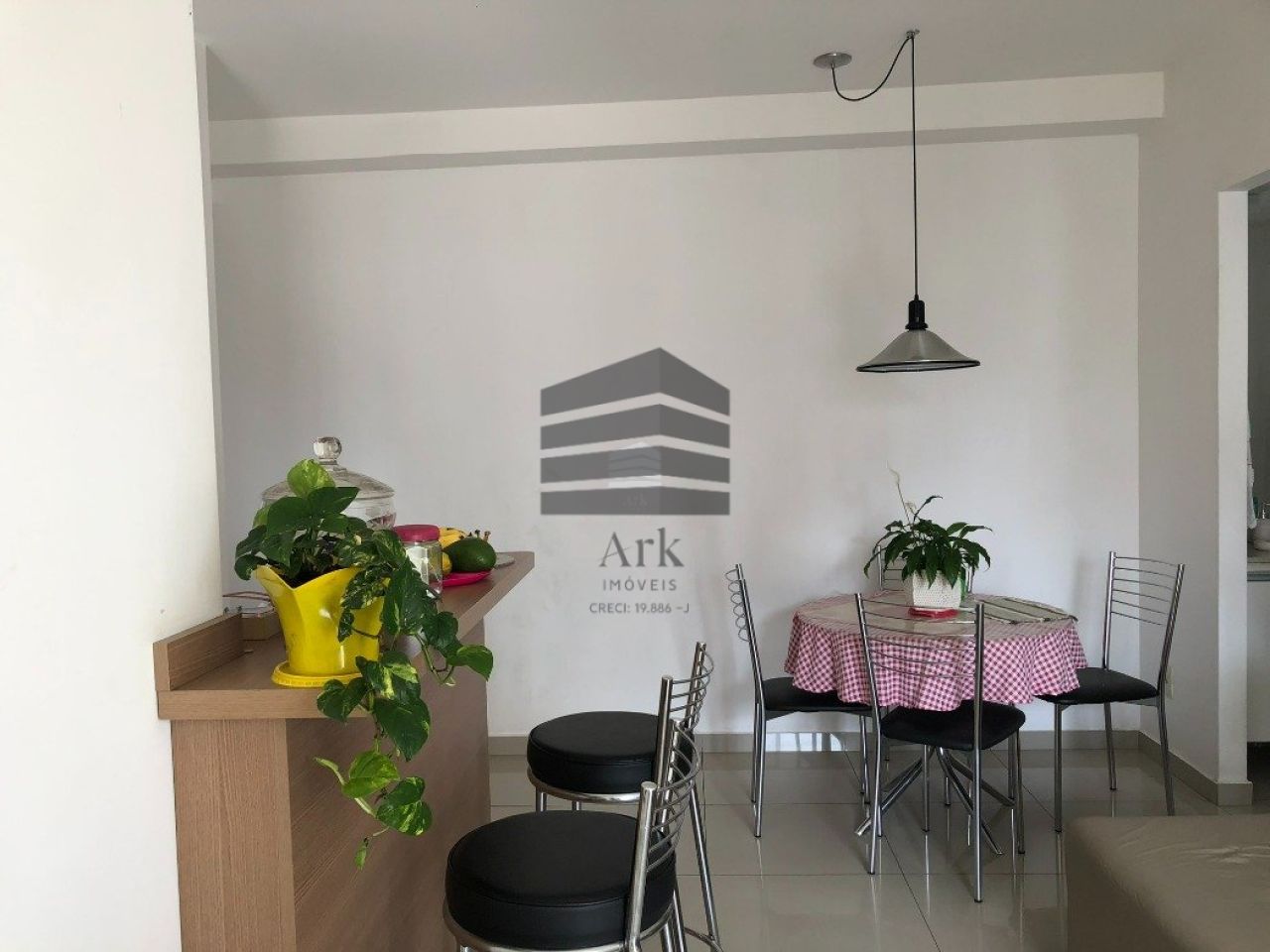Sala para 2 ambientes, cozinha americana com armários, banheiro social.
