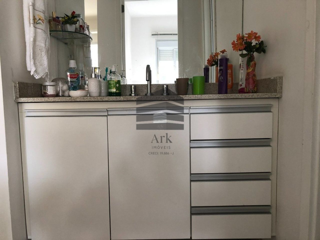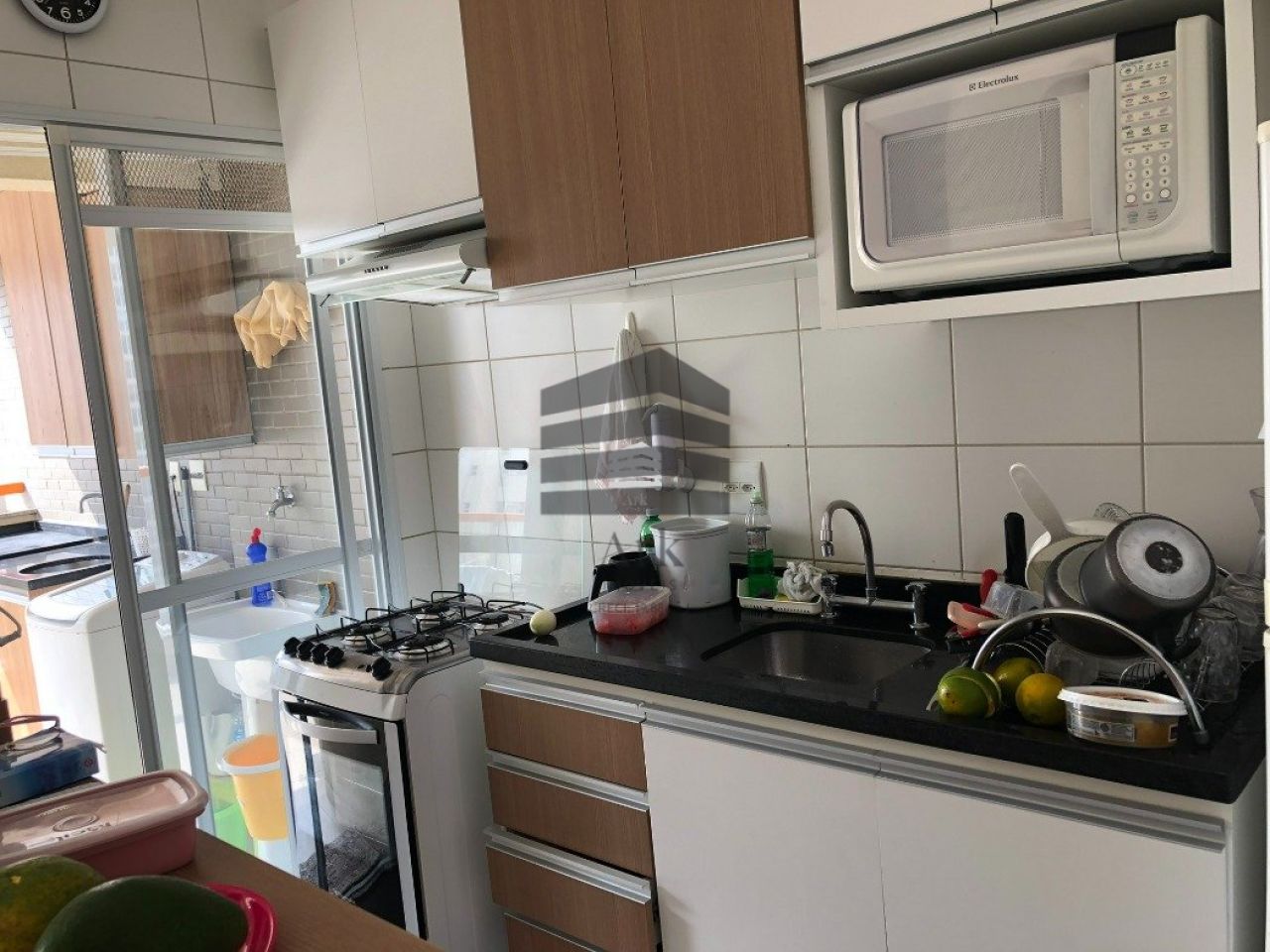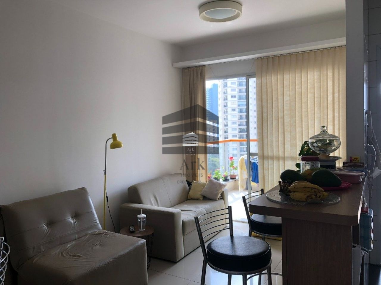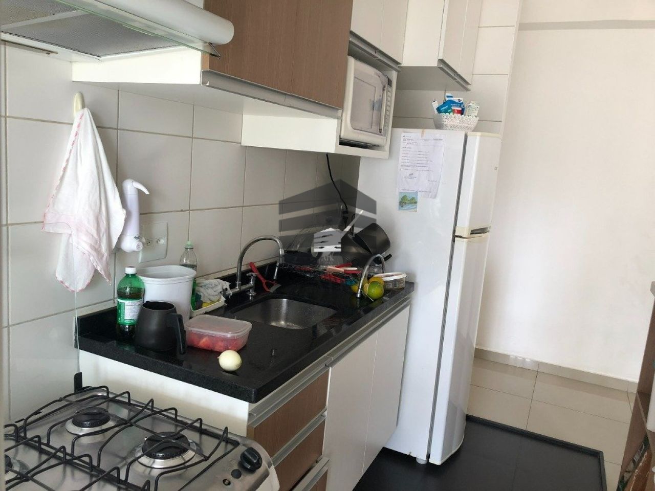 Sala para 2 ambientes, cozinha americana com armários, banheiro social.