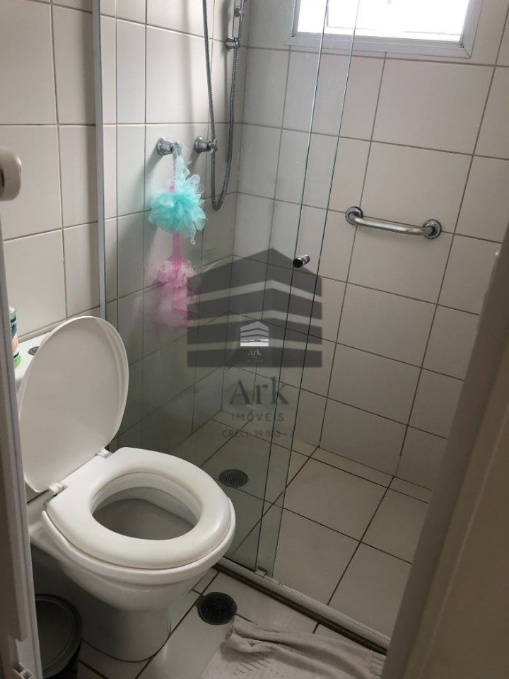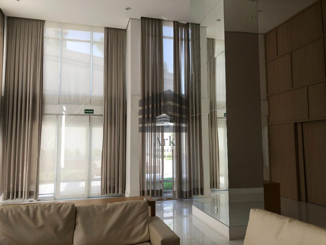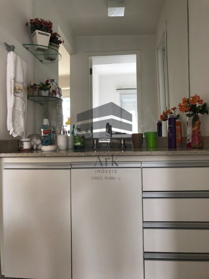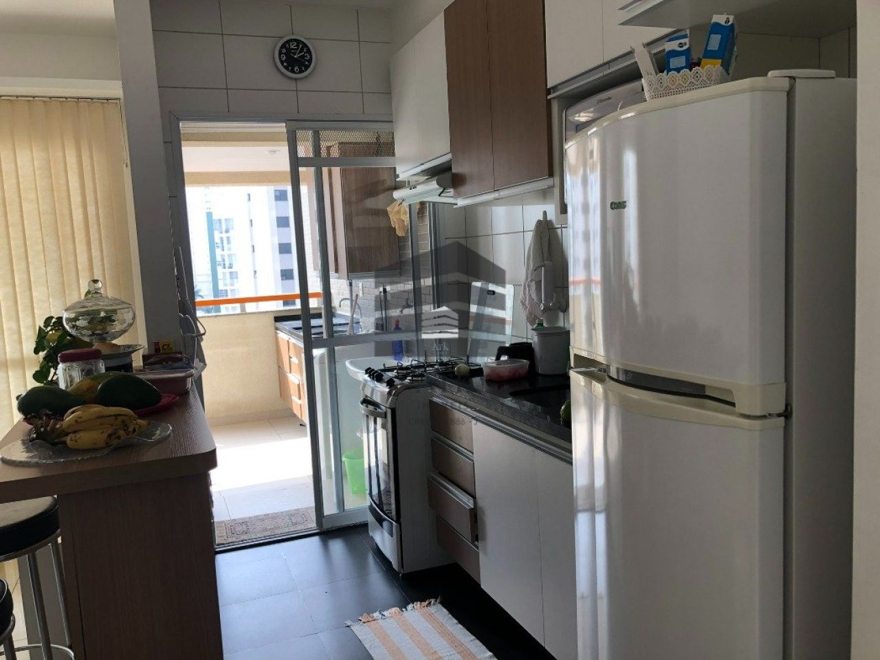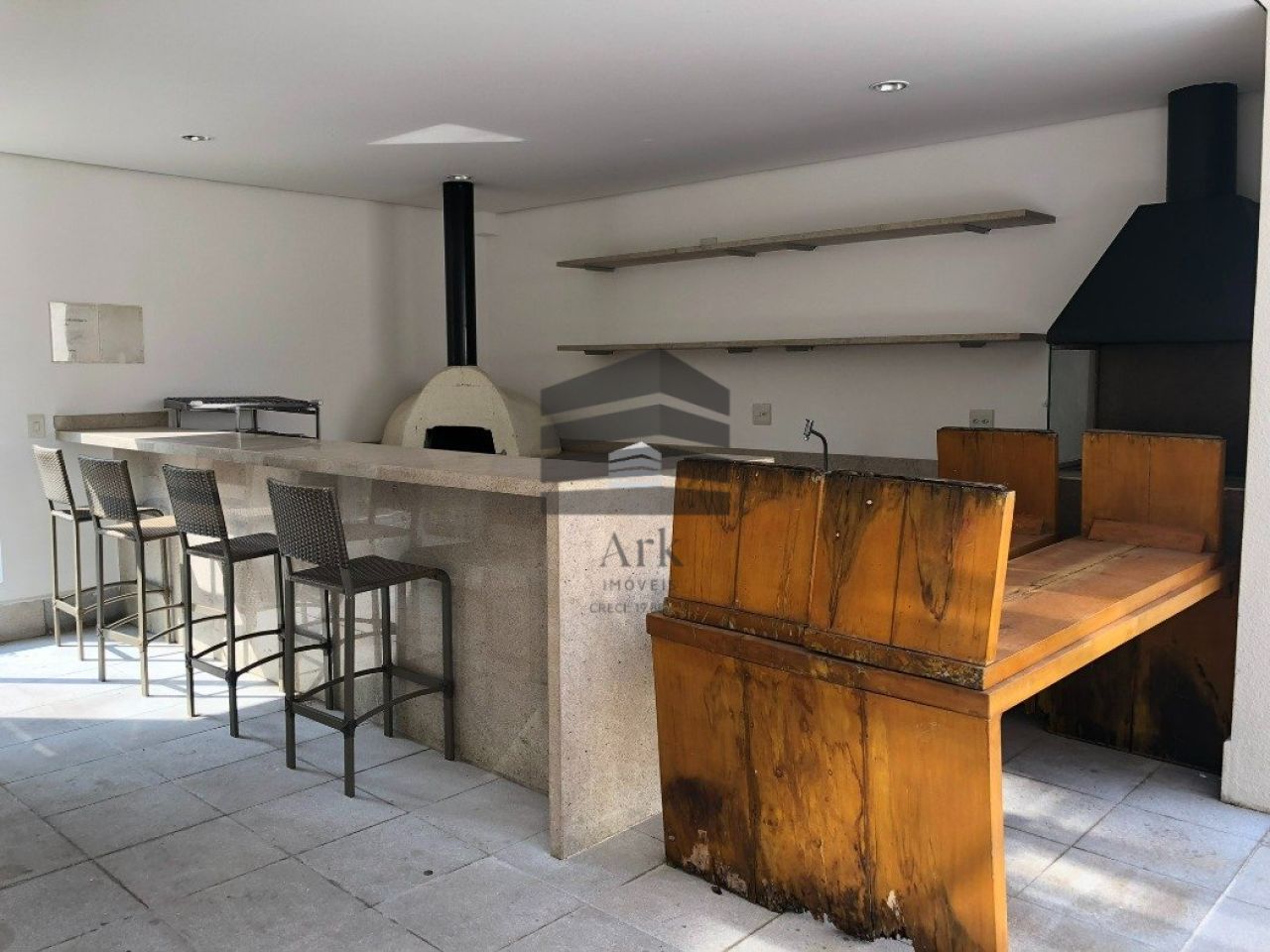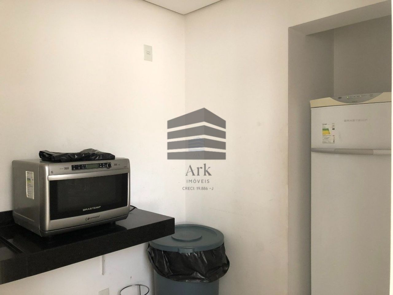 Sala para 2 ambientes, cozinha americana com armários, banheiro social.
