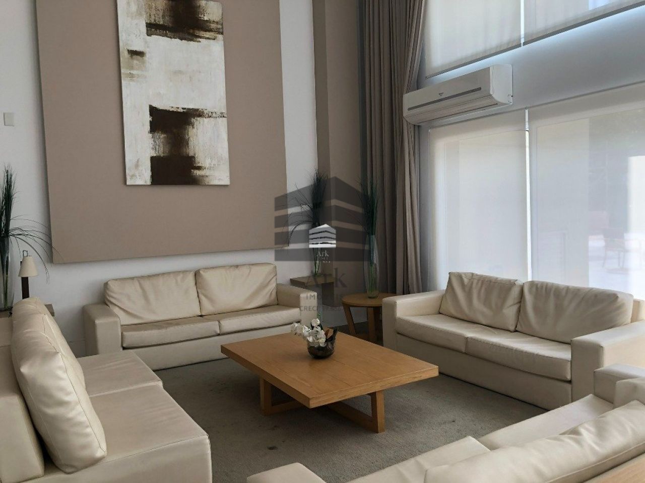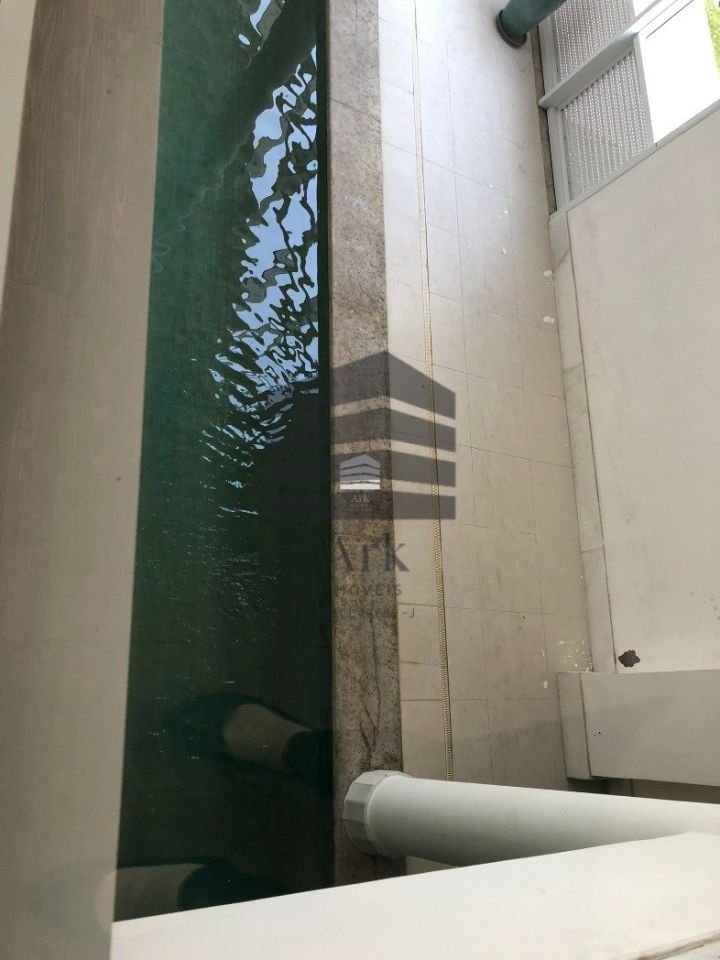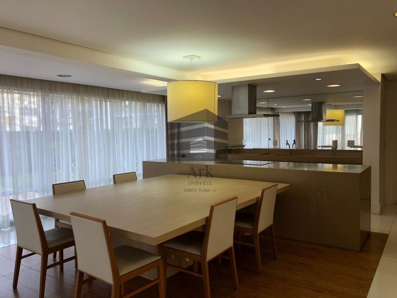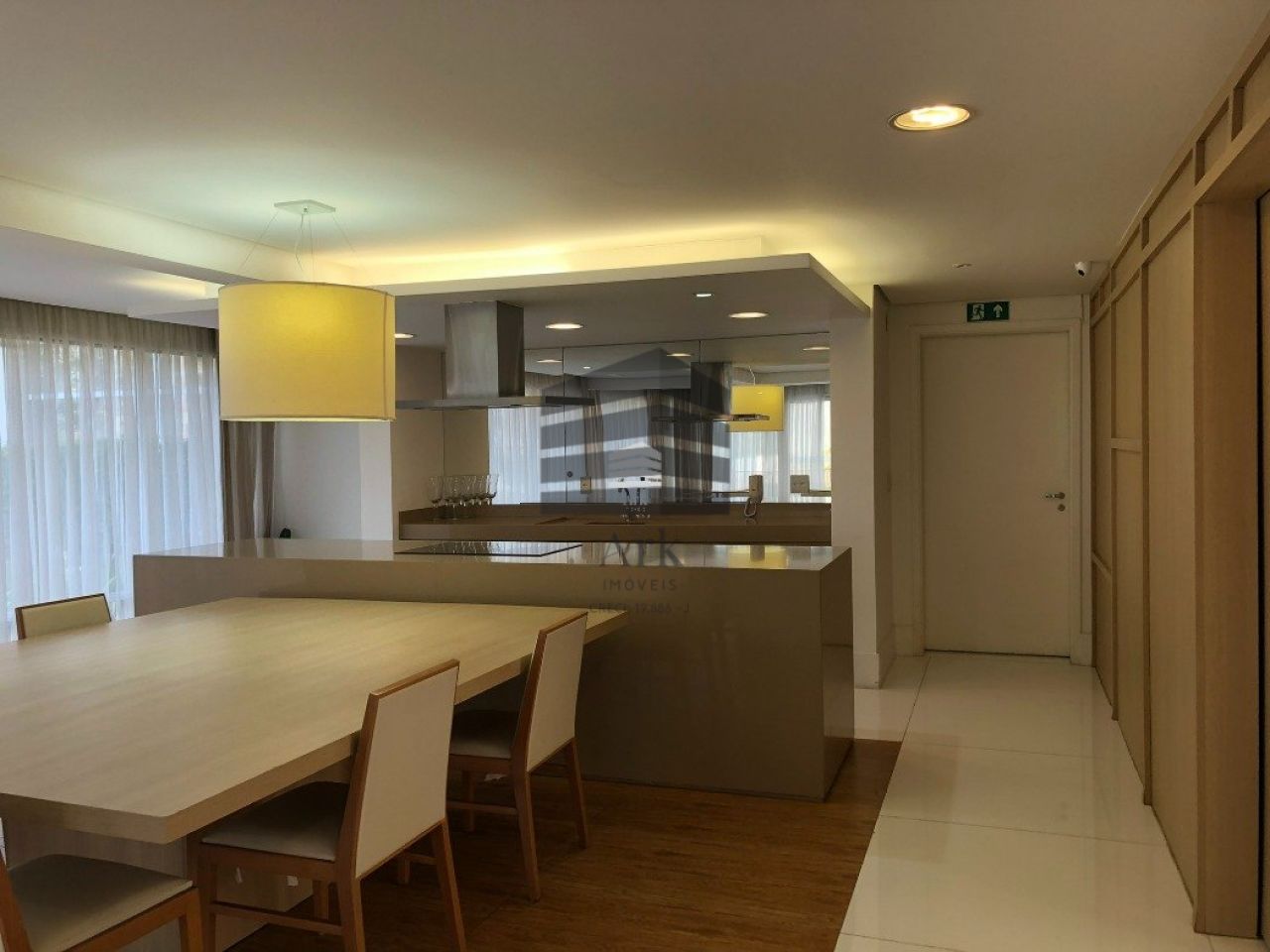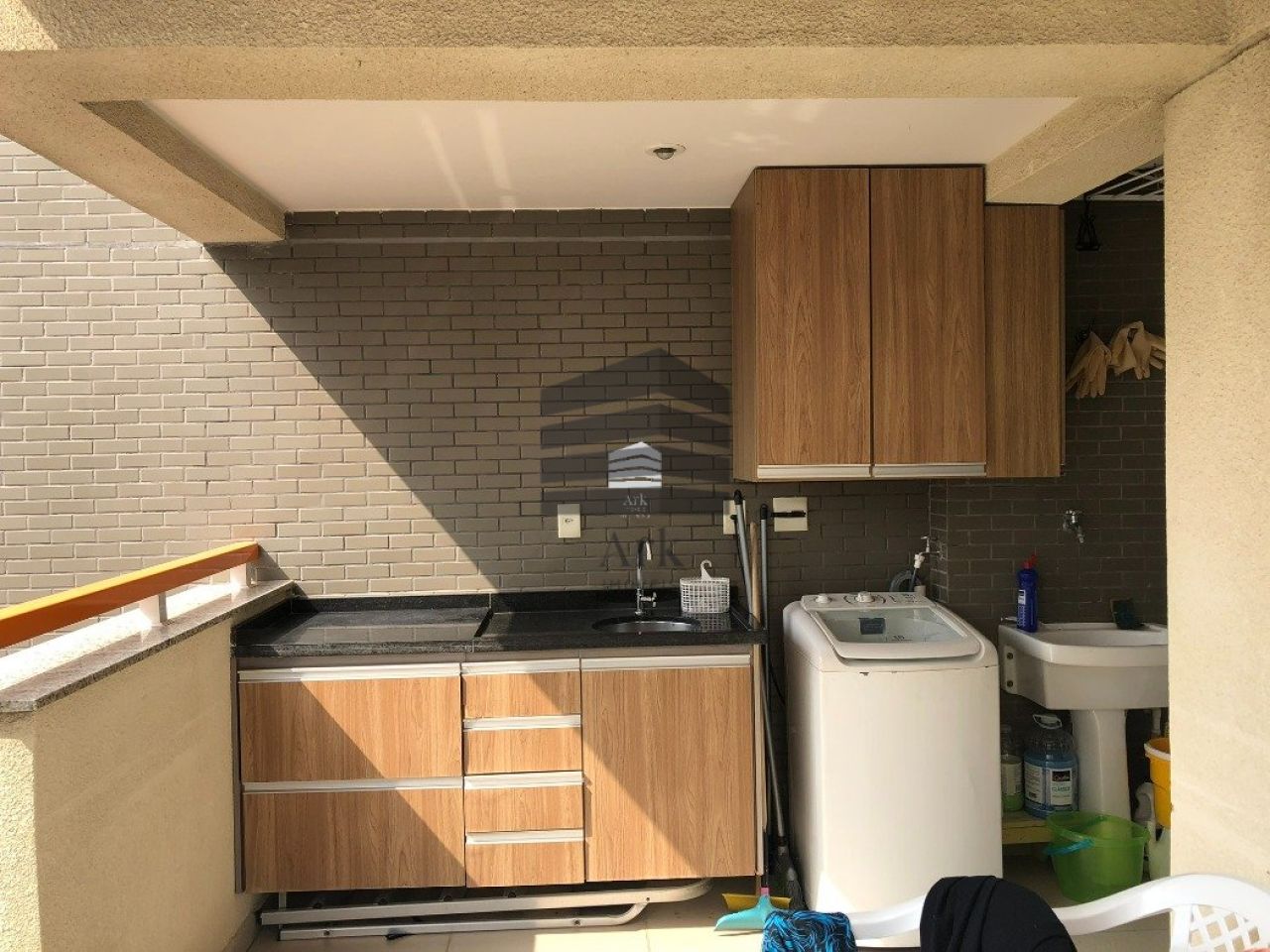 Sala para 2 ambientes, cozinha americana com armários, banheiro social.