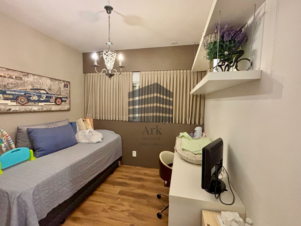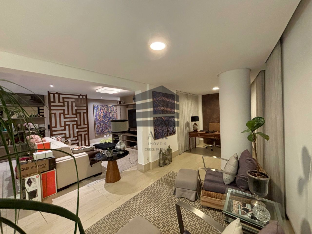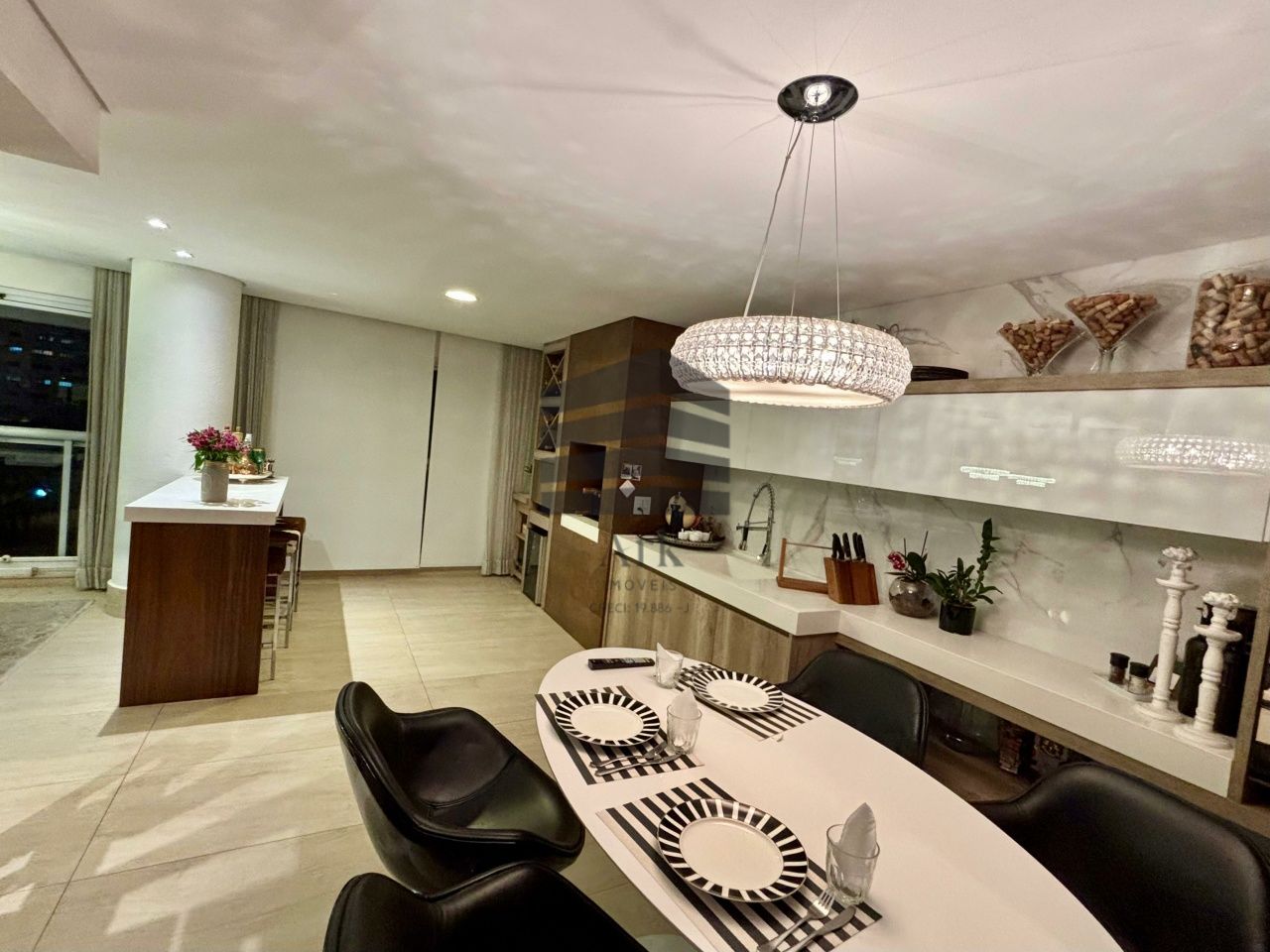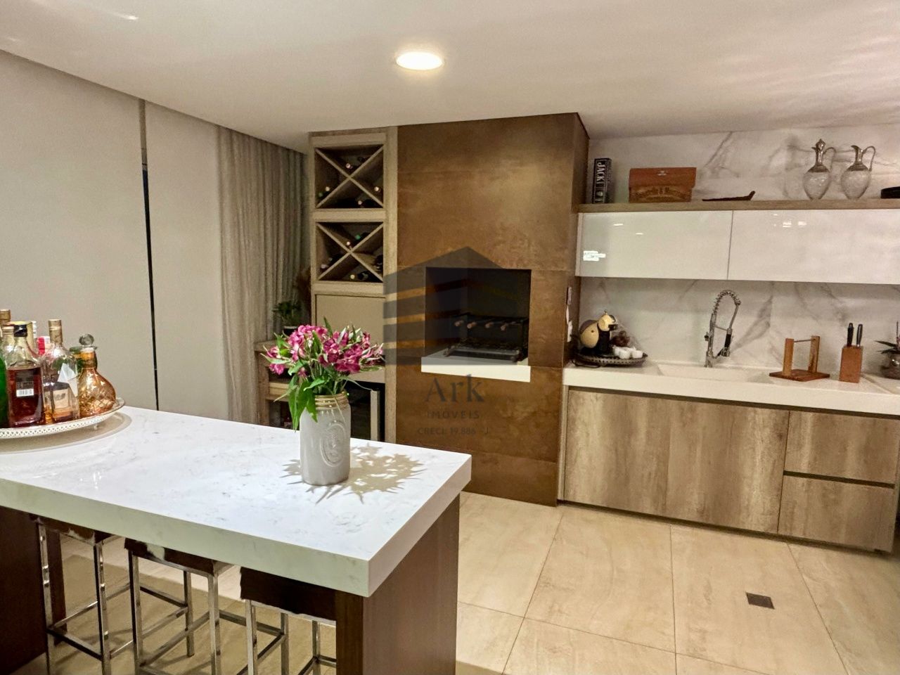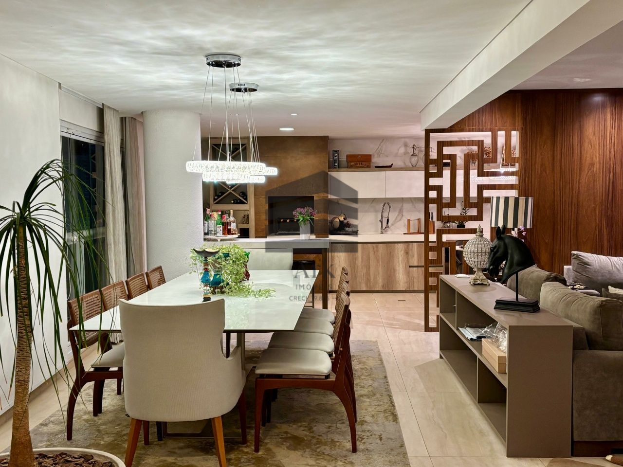 A sala ampla para dois ambientes é integrada à varanda gourmet, fechada com vidros retráteis, equipada com churrasqueira, ideal para receber amigos e familiares com conforto e privacidade. O ambiente é banhado por luz natural e proporciona uma vista aberta da região.