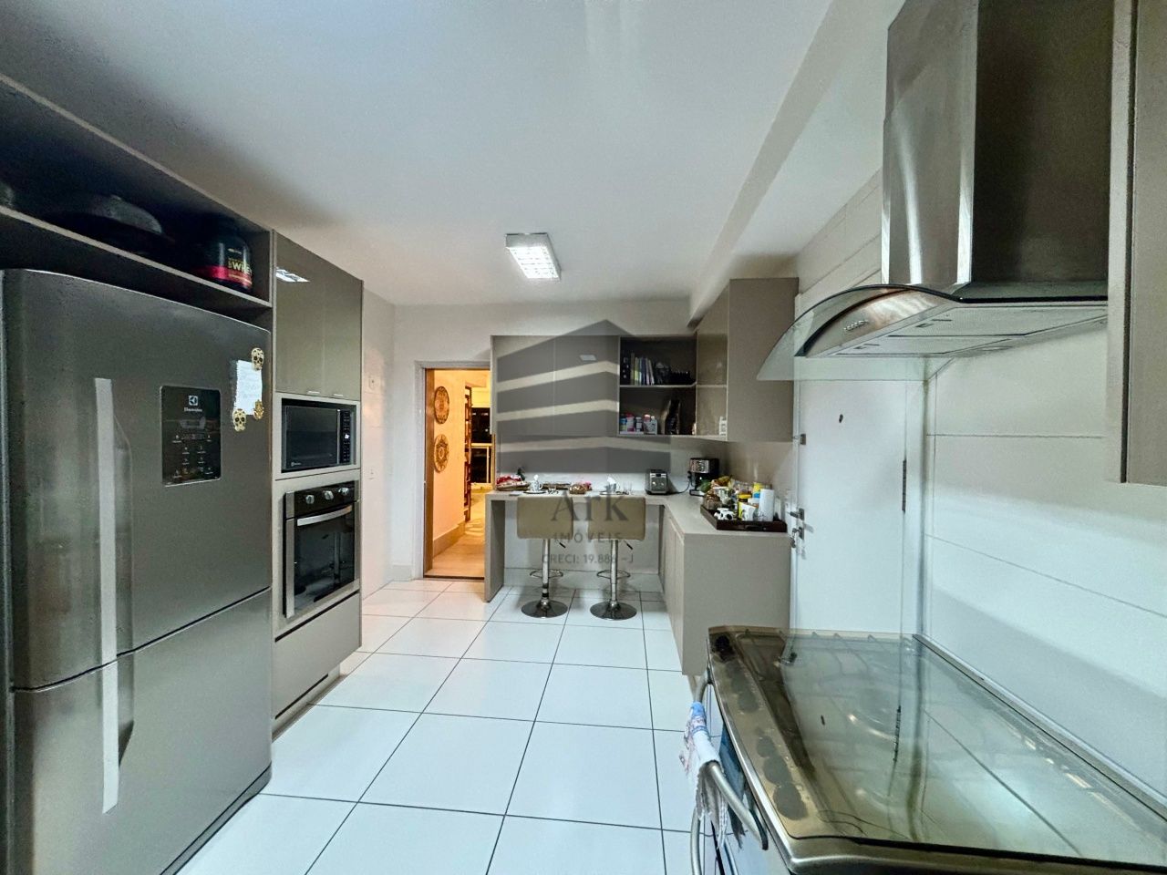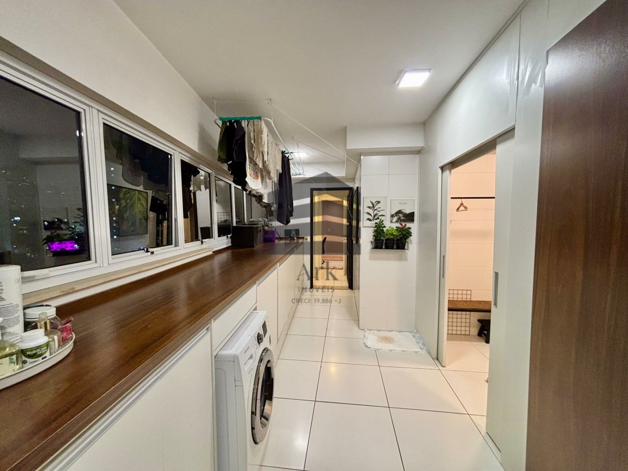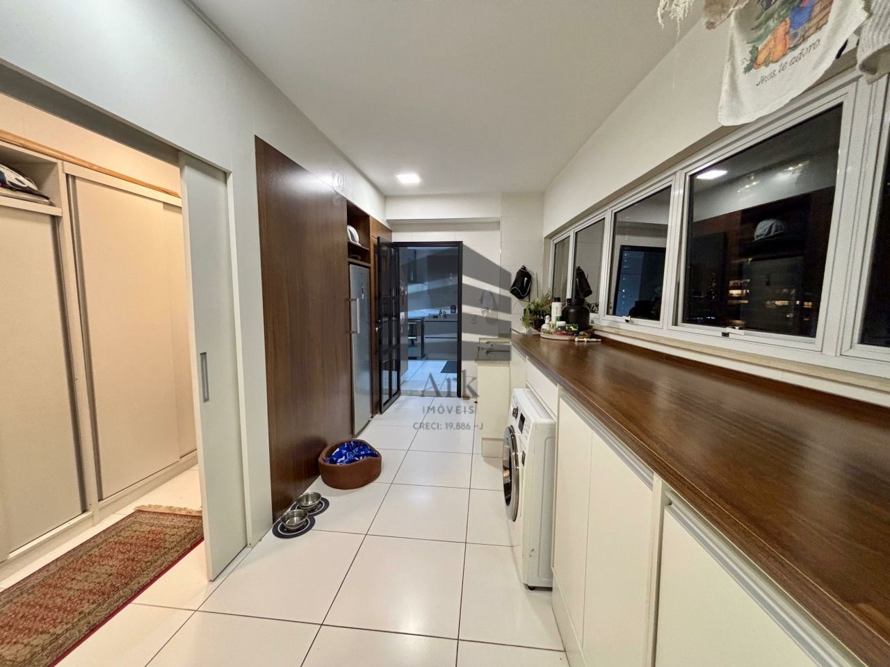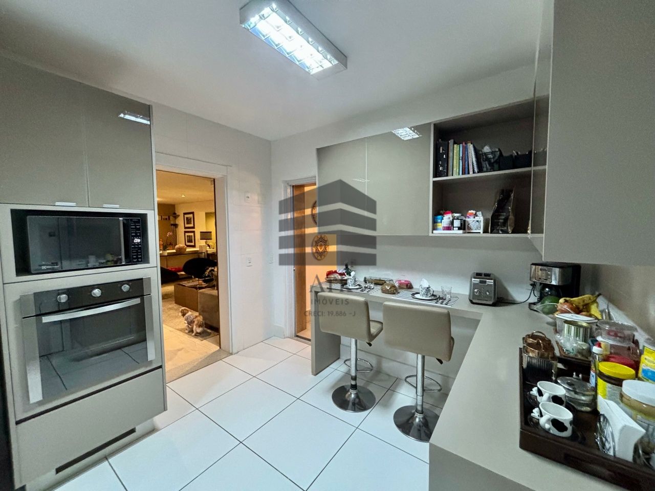 A cozinha é ampla e equipada, com ótimo espaço de bancada e armários planejados. A área de serviço é grande, ventilada, com WC e quarto de apoio, além de despensa.