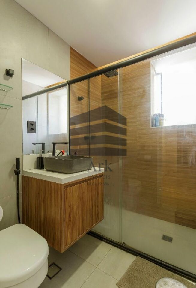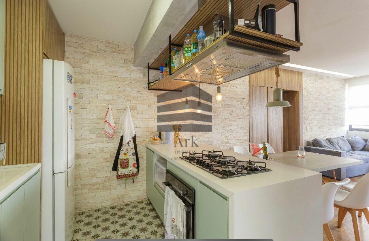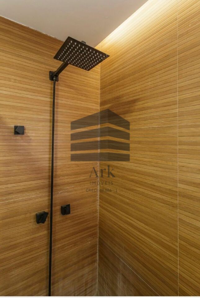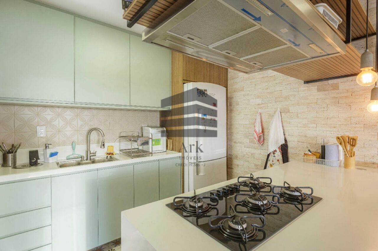 Os armários da cozinha, da área de serviço, do banheiro e do roupeiro são novos e modernos. Há um lindo e moderno painel ripado usado como divisória entre a sala e a cozinha.