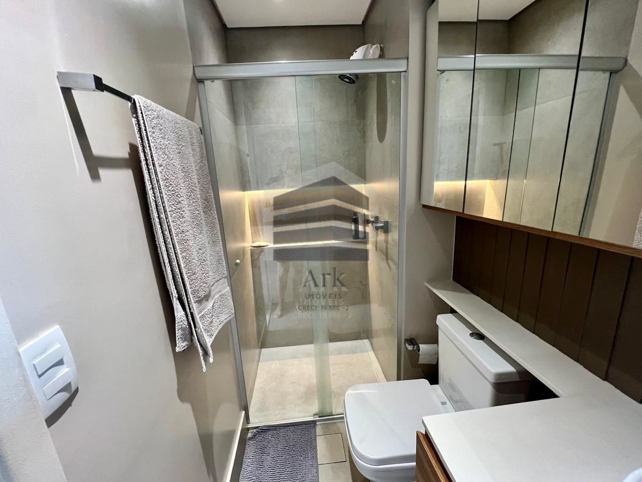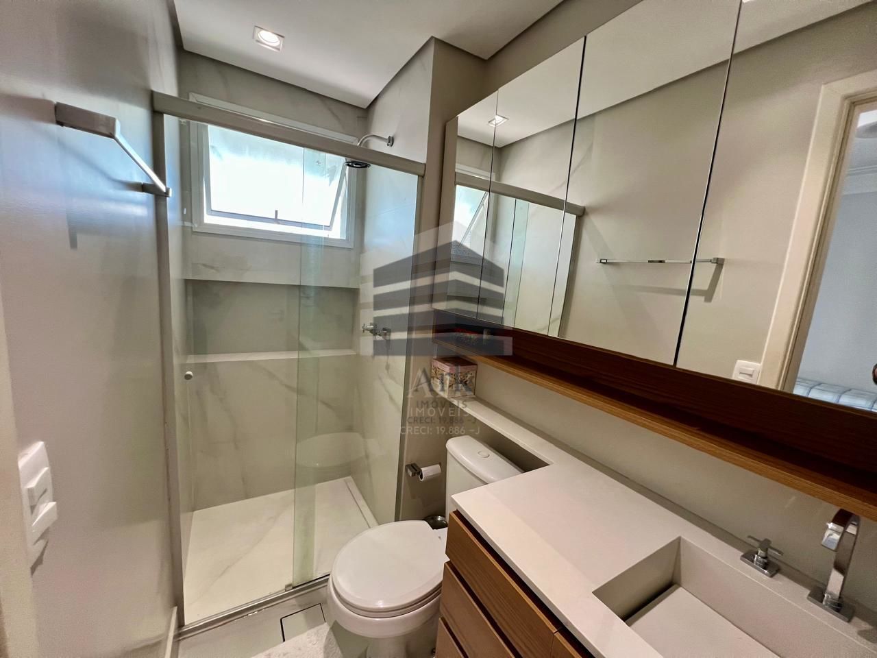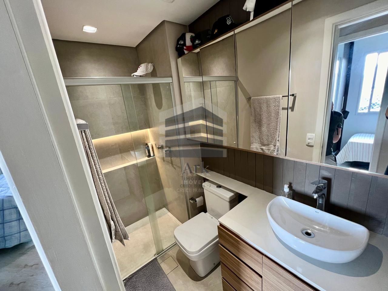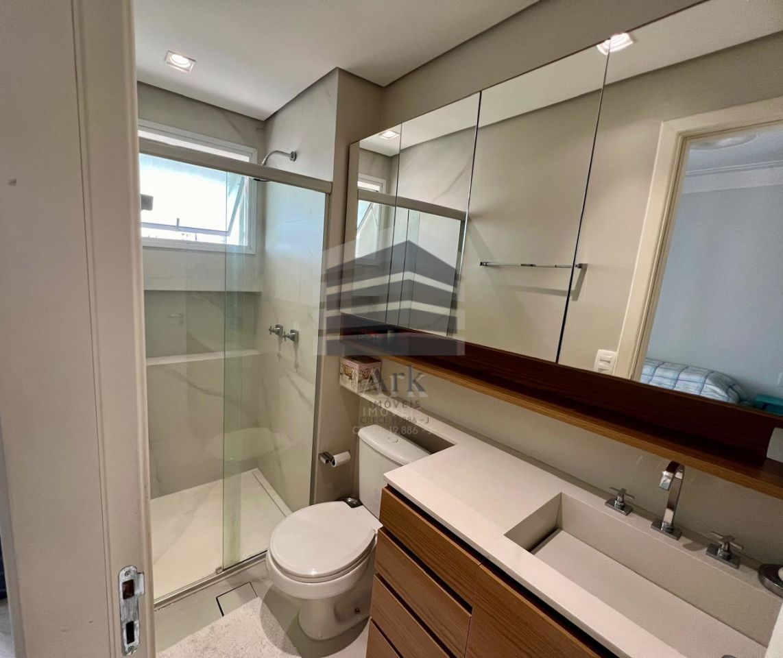 Os banheiros são reformados e possuem parede espelhada, armários e revestimentos em porcelanato.