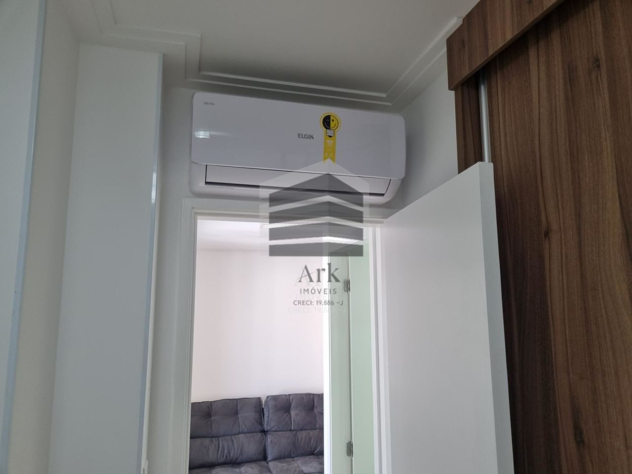 ? Apartamento mobiliado com planejamento inteligente: cama, armários, ar-condicionado, TV, fogão, geladeira, micro-ondas e fechadura eletrônica.