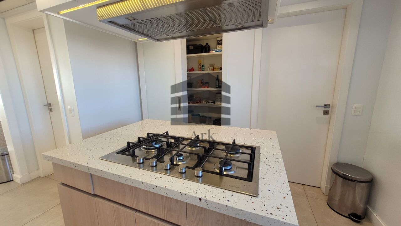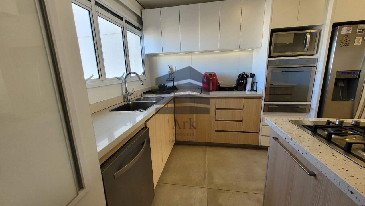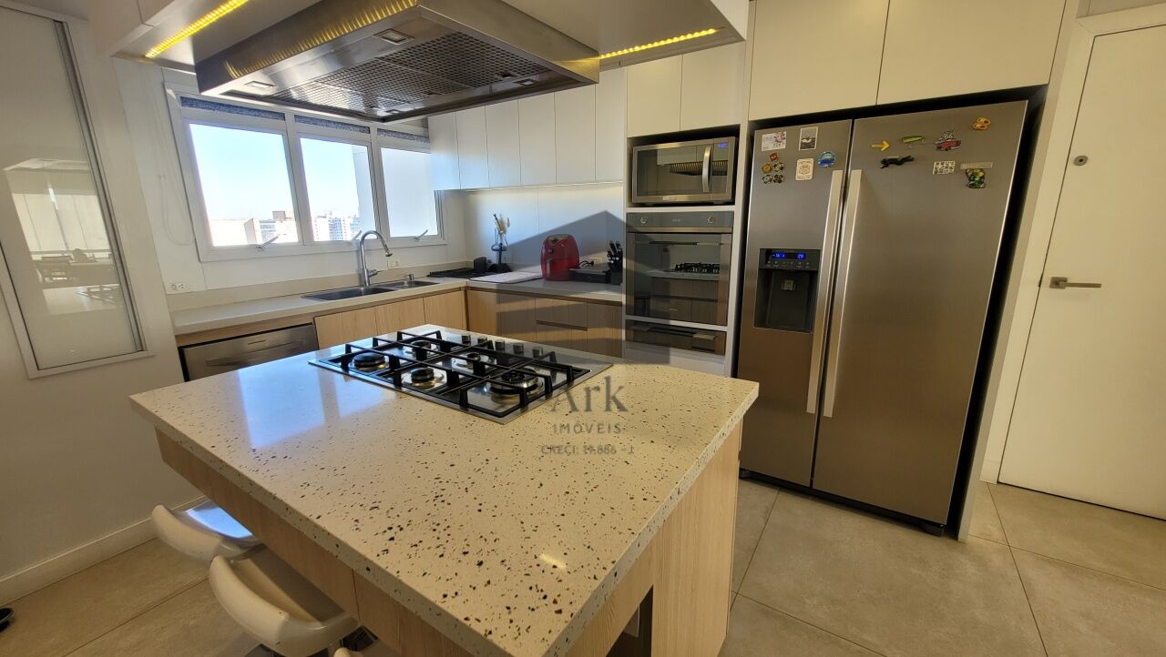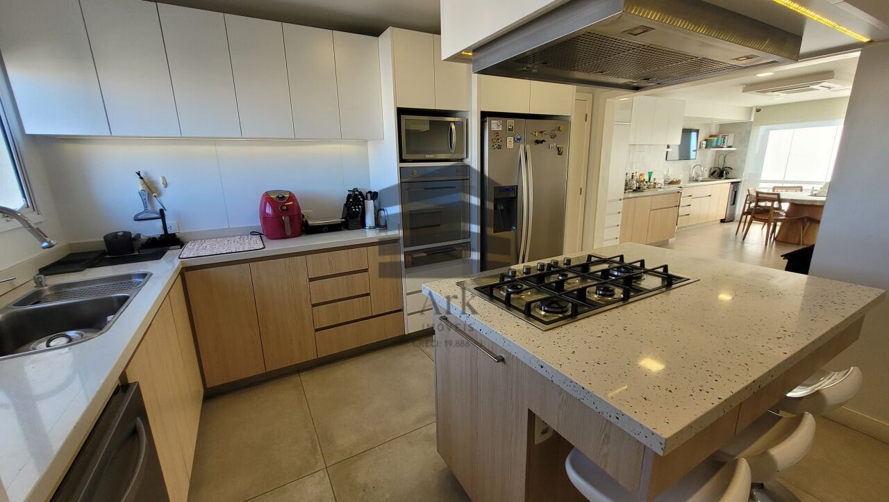 A cozinha segue o conceito em ilha, equipada com cooktop, máquina de lavar, forno italiano com função para pizza, gaveta térmica, geladeira e freezer. As bancadas da cozinha e da área de serviço são em Silestone.