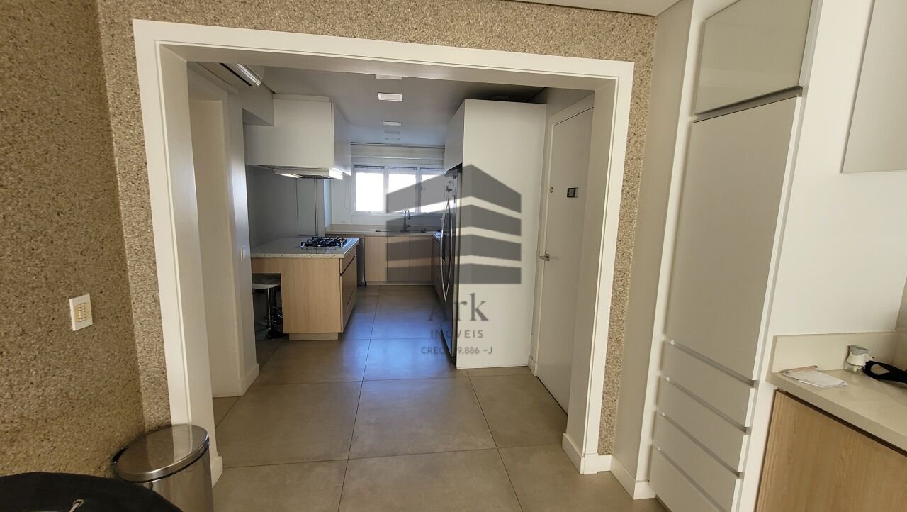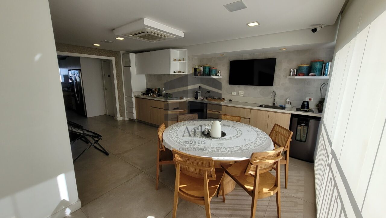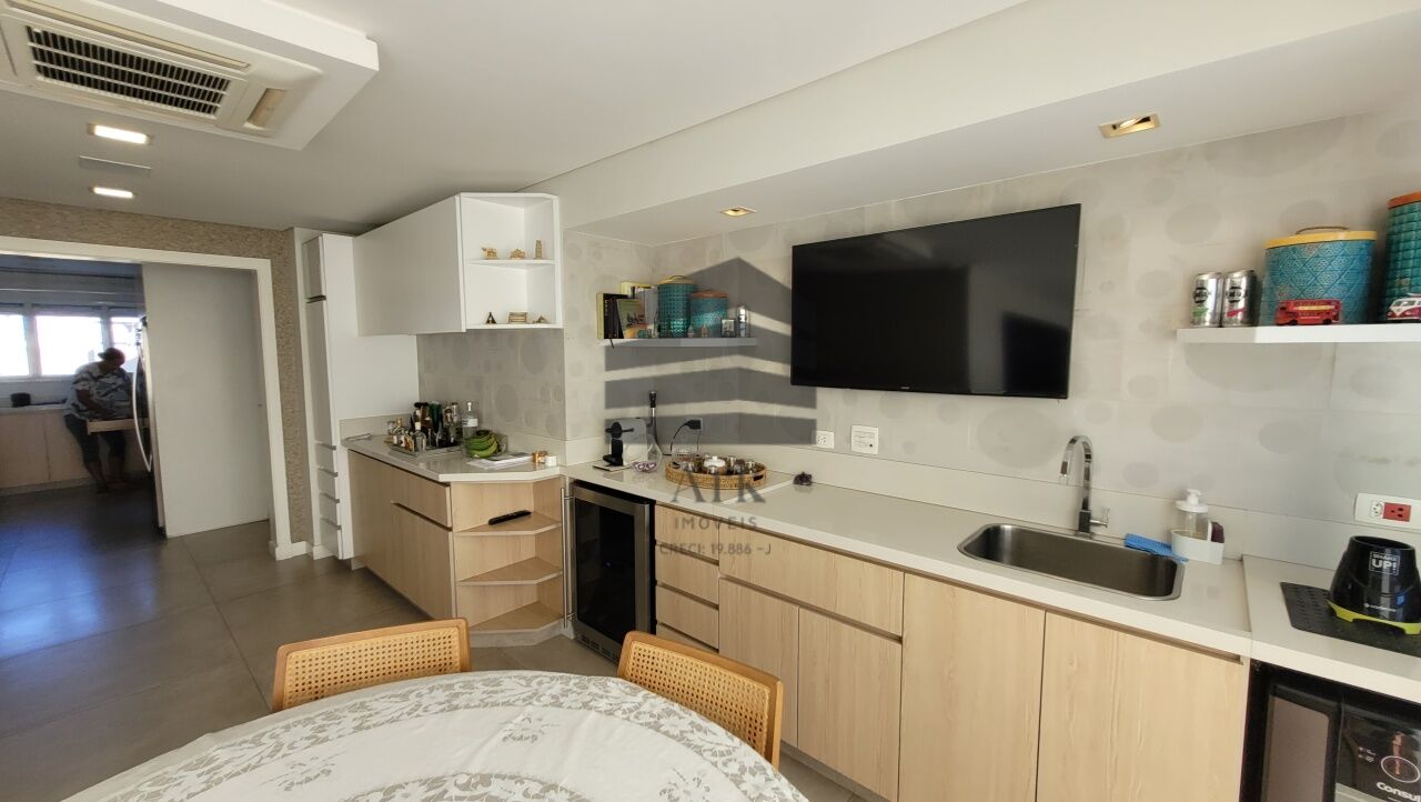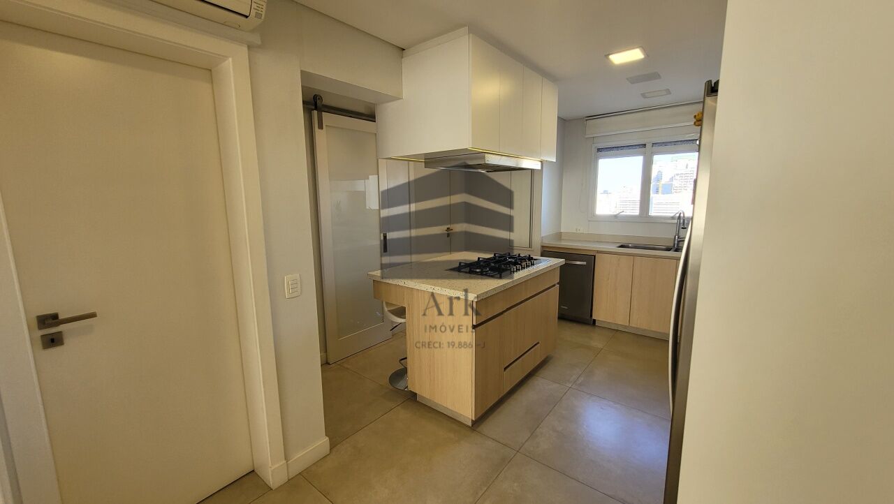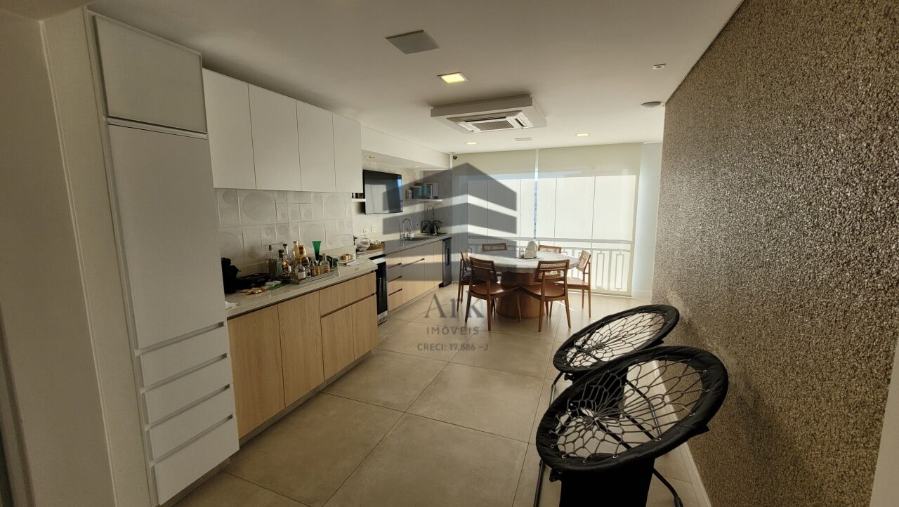 A cozinha segue o conceito em ilha, equipada com cooktop, máquina de lavar, forno italiano com função para pizza, gaveta térmica, geladeira e freezer. As bancadas da cozinha e da área de serviço são em Silestone.