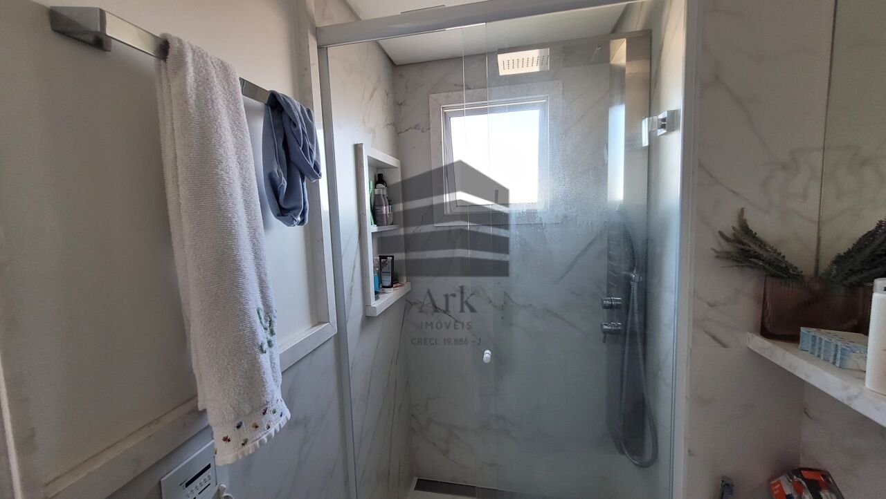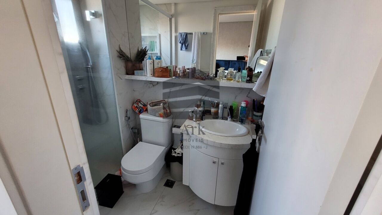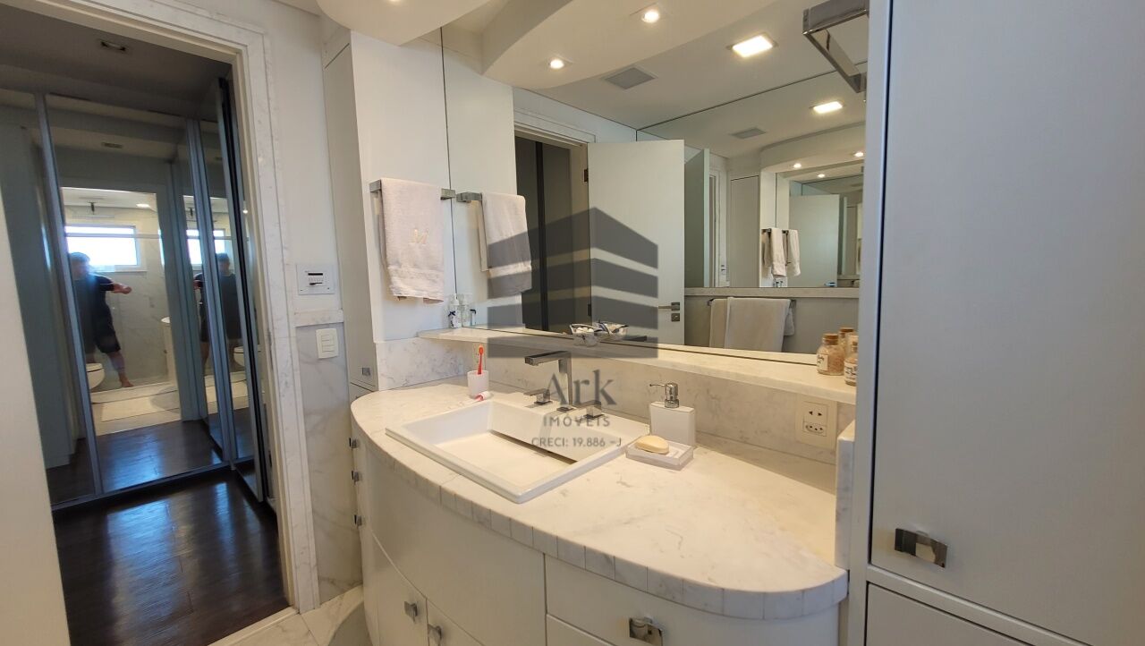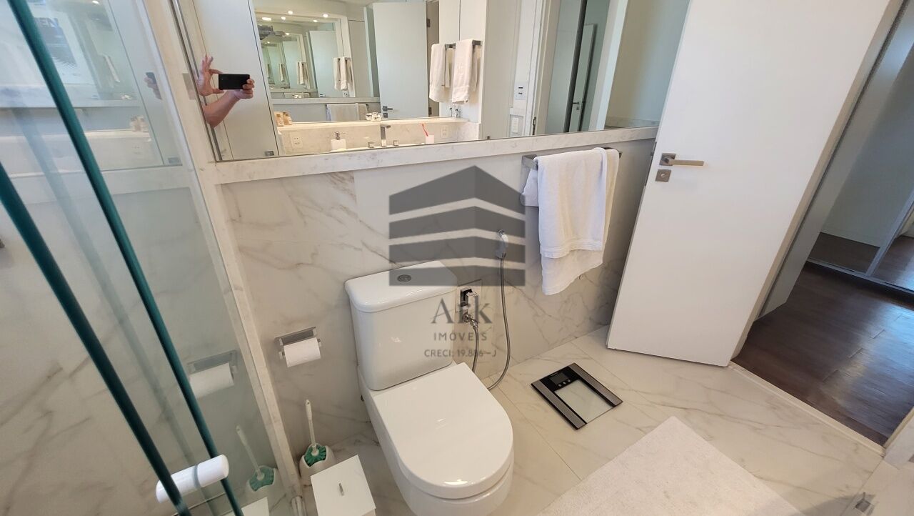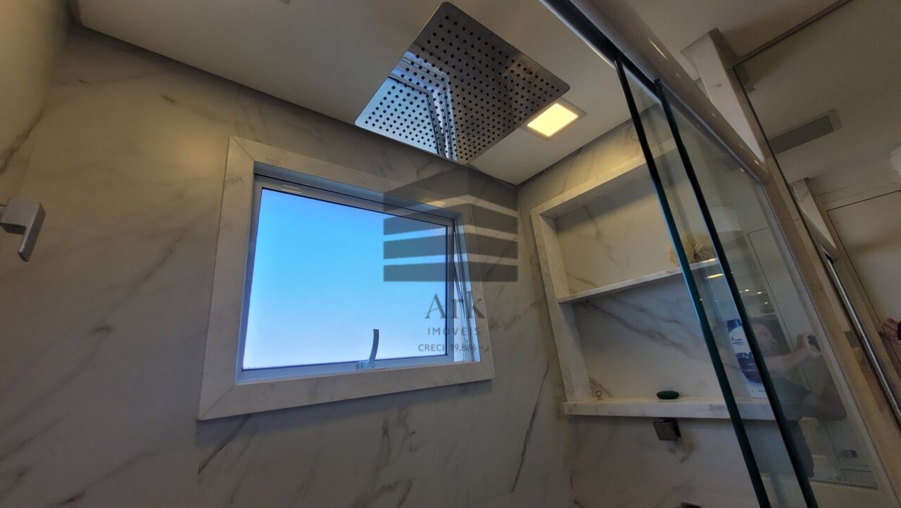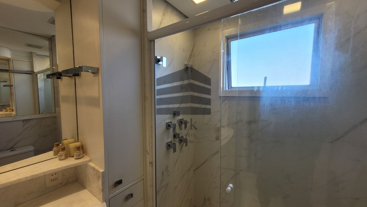 Os banheiros apresentam acabamento sofisticado, com portas laqueadas, molduras e batentes em mármore Carrara, pias em mármore, além de sistema de sonorização Bluetooth e iluminação com dimerização.